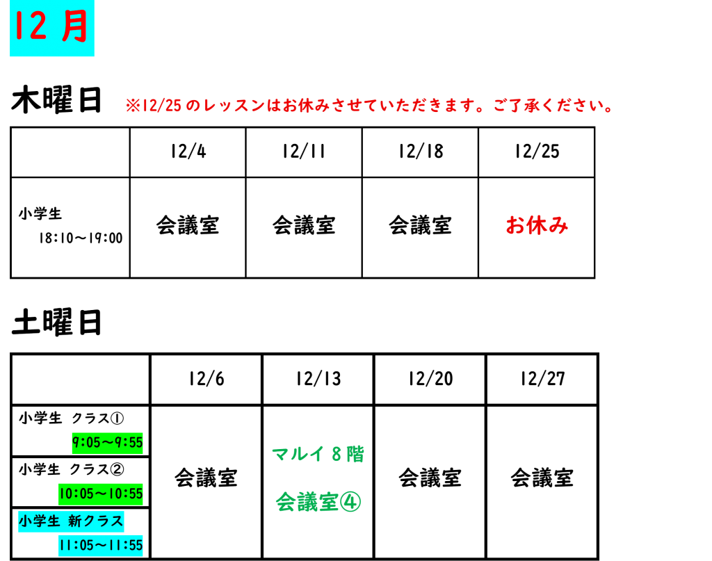 12月のレッスンスケジュールを掲載しました。
